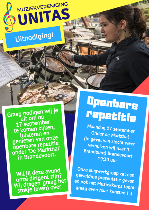 Graag nodigen wij je uit om op 17 september te komen kijken, luisteren en genieten van onze openbare repetitie onder ‘De Markthal’ in Brandevoort!